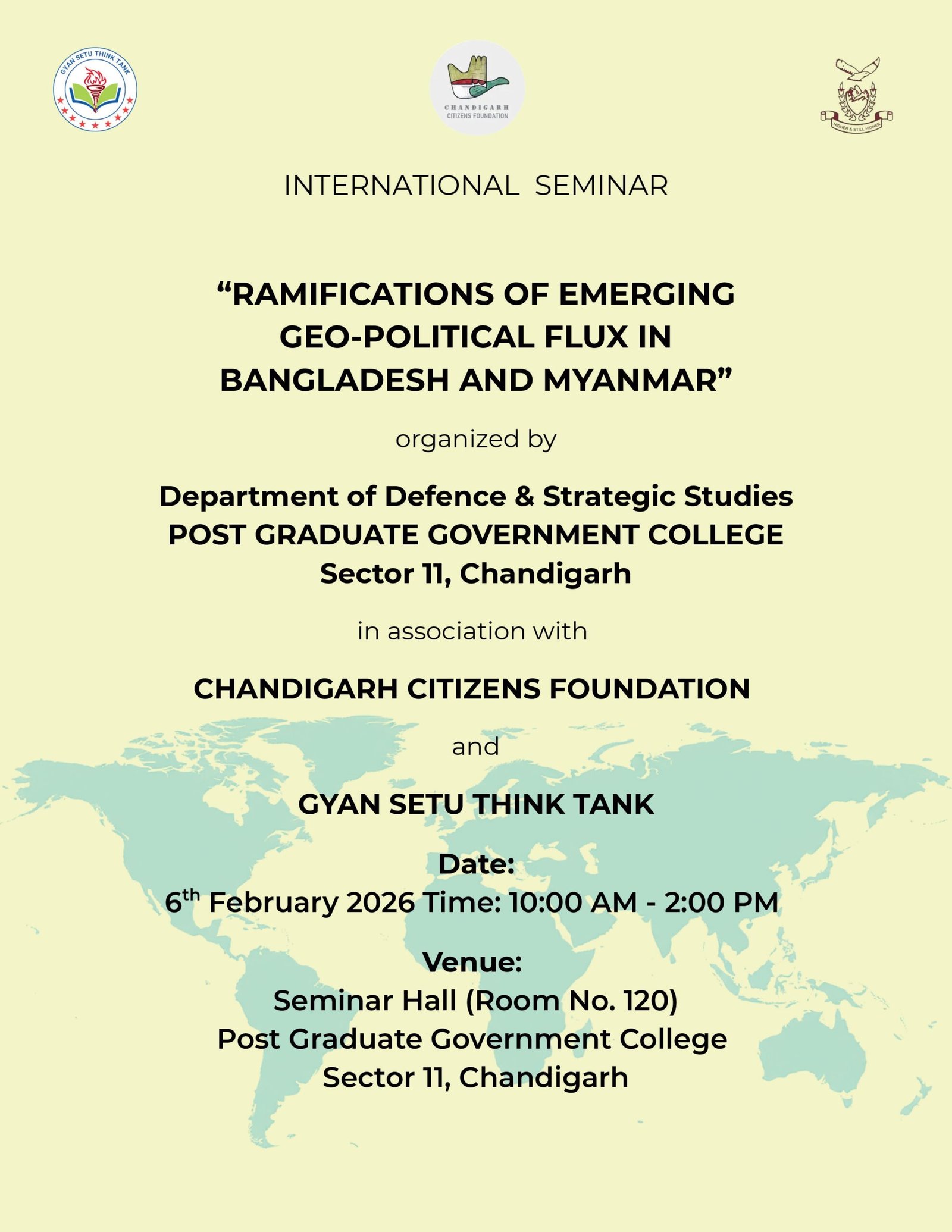 On 6 February 2026, the Department of Defence and Strategic Studies at Post Graduate Government College, Sector 11, Chandigarh hosted an international seminar titled “Ramifications of Emerging Geopolitical Flux in Bangladesh and Myanmar.” The seminar aimed to examine shifting political and security dynamics in India’s eastern neighbourhood and assess their implications for Indian strategic interests.
